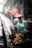 «Девочка в шляпе с букетом роз на ступенях»
